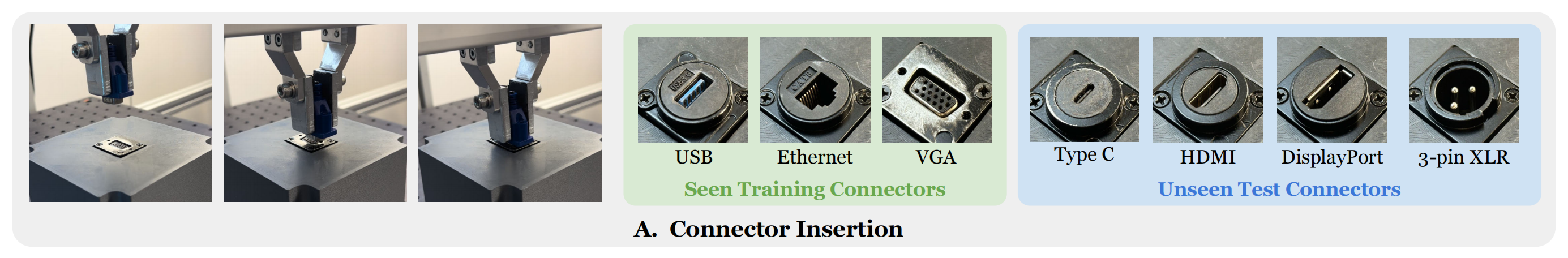 本任务要求将各种电子连接器插入其匹配的端口,这需要亚毫米级的精度和灵巧性,以应对对齐过程中复杂的接触动态