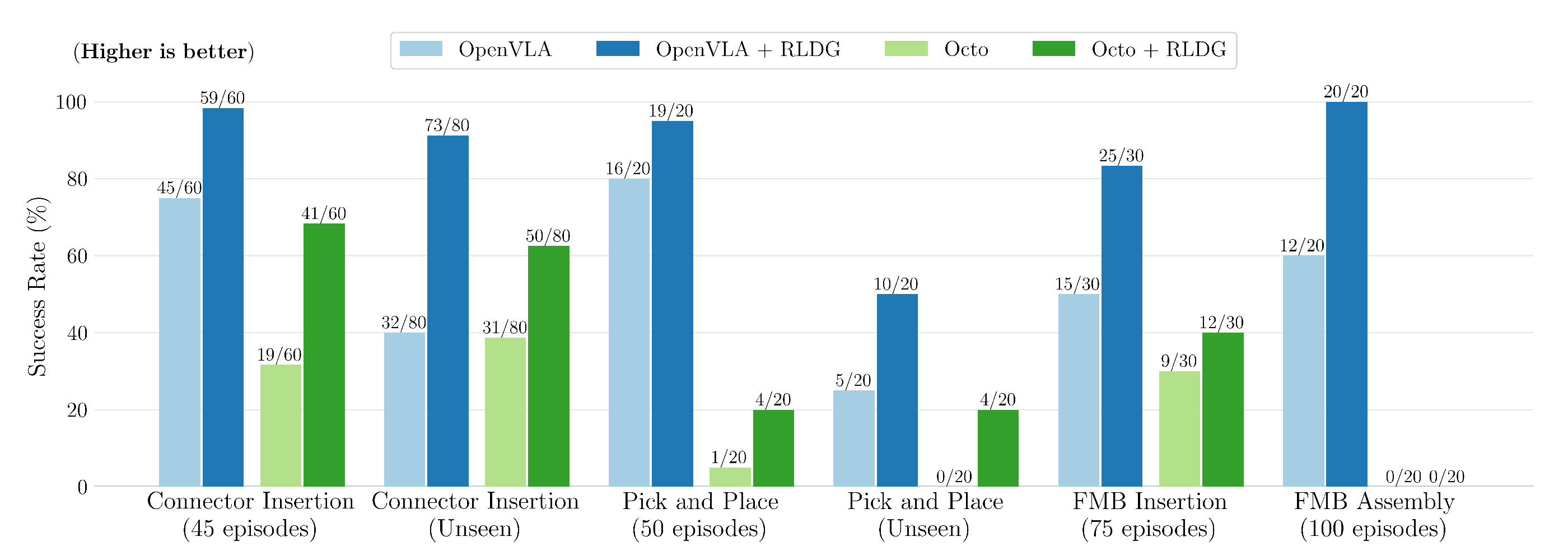 在preciseFMB插入和Connector插入任务中,作者预期通用模型能从更高质量的训练数据中获益最大,结果显示,采用RLDG的OpenVLA成功率分别比基线高出33%和23%。RLDG对Octo的提升同样显著,其成功率分别提高了10%和分别为37%,尽管整体成功率仍低于OpenVLA