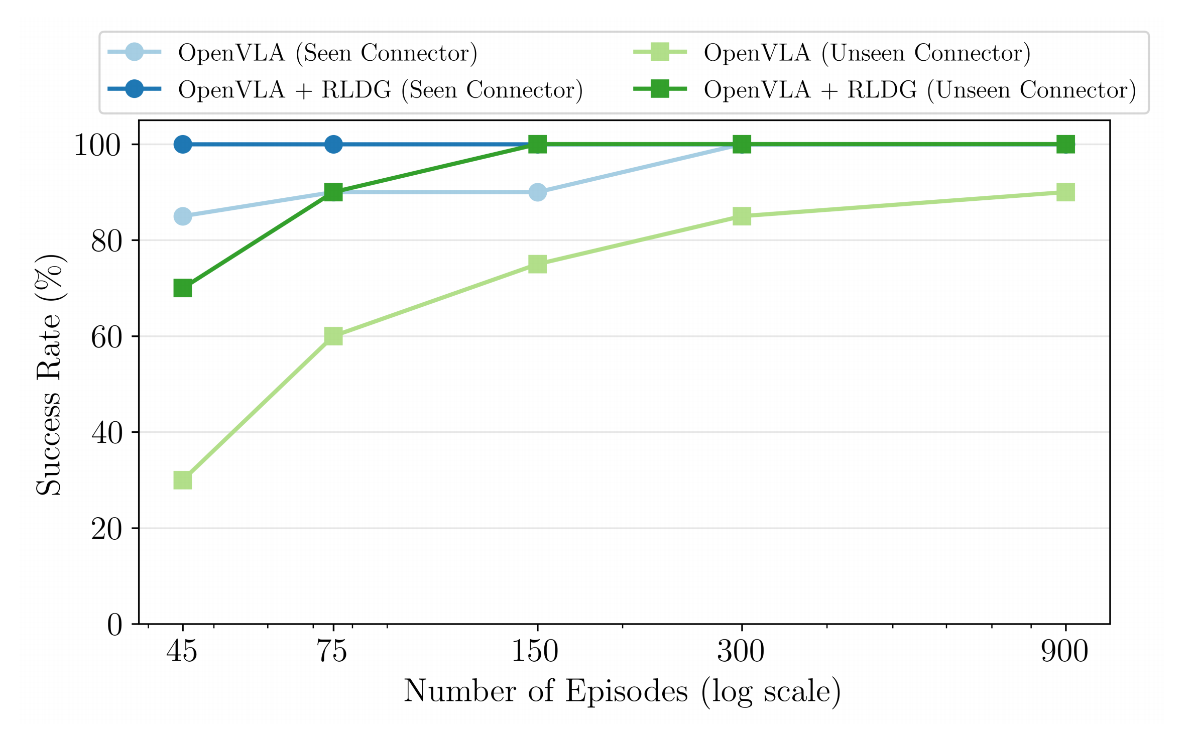 对于VGA连接器,采用RLDG的OpenVLA仅需45个RL训练集就实现了100%的成功率,而要达到相同成功率,人工演示则需要300个训练集