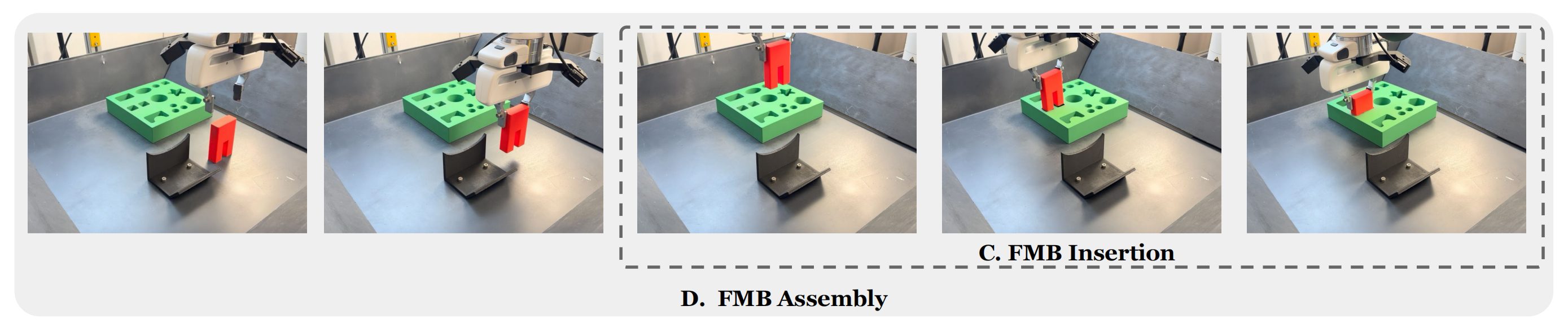 作者还采用了 FMB 中的单物体插入任务,这是比较机器人操作方法时常用且可复现的基准测试。该任务要求将已抓取的物体插入到具有±1.5毫米公差的匹配开口中,且位置为随机分布 - FMB单物体装配