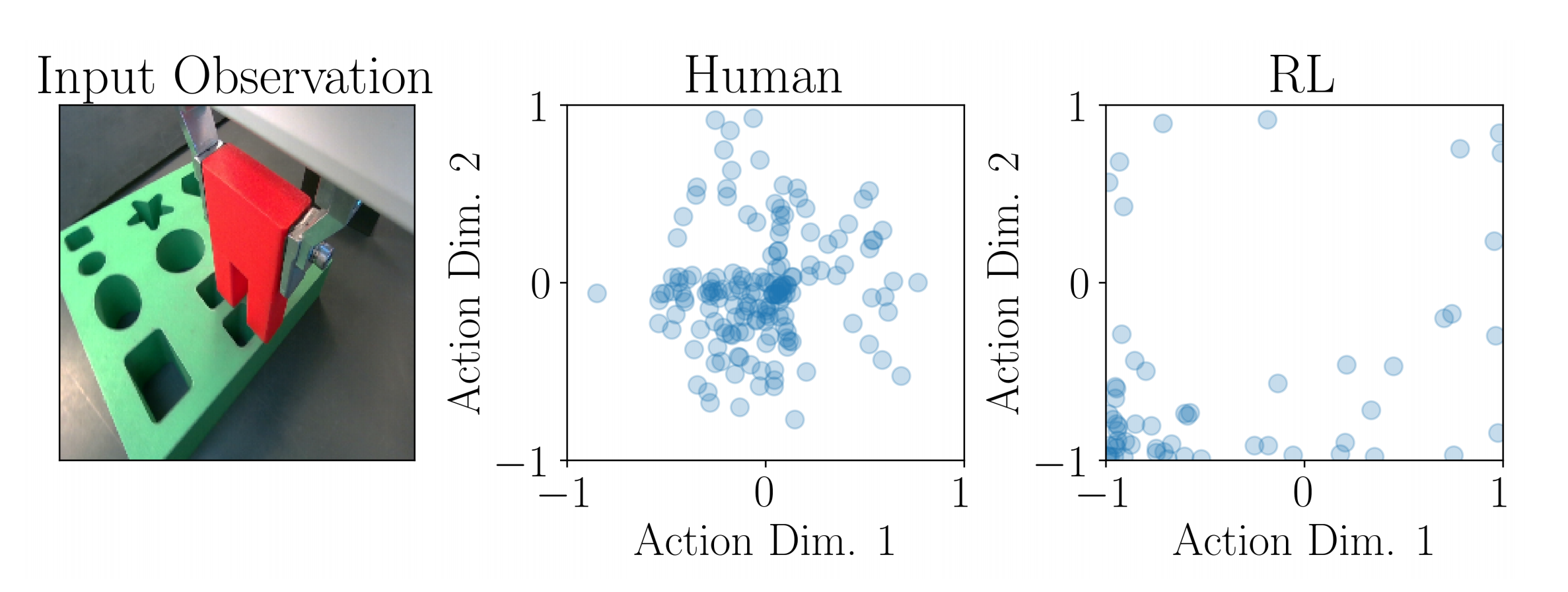 可以看到,RL动作分布在正确方向(左下方)上分配了更多的概率密度,该方向能够将末端执行器朝插入点移动,而人类动作分布则主要集中在中间,只有轻微偏向正确方向
