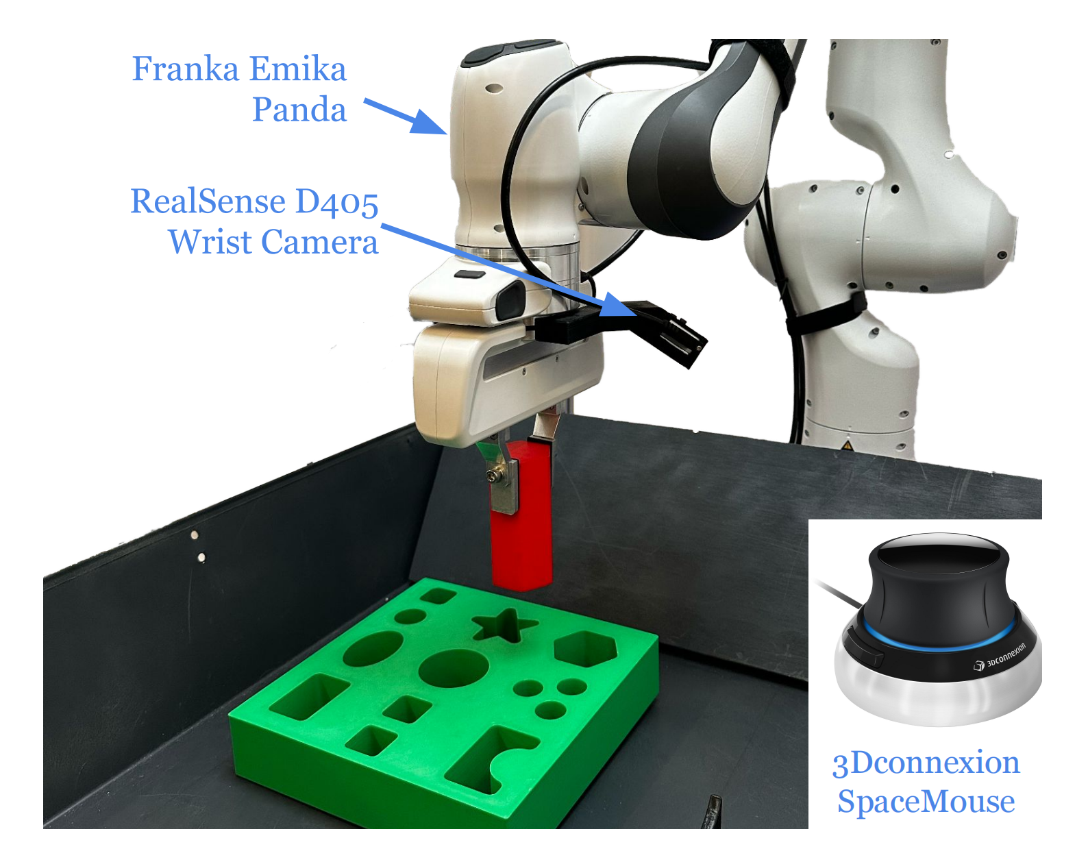 所有实验的机器人设置如图2所示「使用一台配备平行夹爪的Franka Emika Panda机械臂,通过3Dconnexion SpaceMouse设备进行远程操作。机器人手腕上安装有一台RealSense D405相机,用于图像观测」