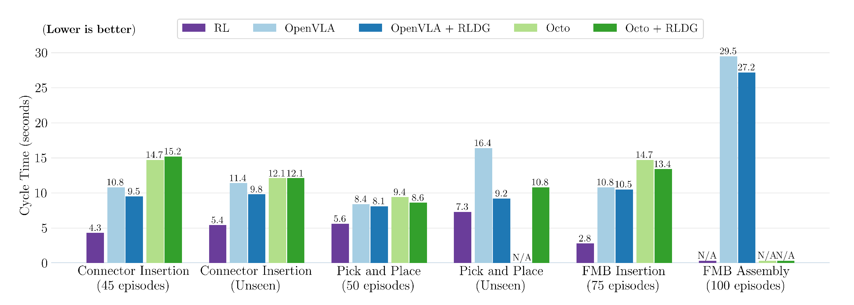 这些结果强烈表明,利用RLDG微调通用策略在样本效率上更高,并且在分布内任务和未见任务上都能获得比人类演示更优的性能 - 周期时间