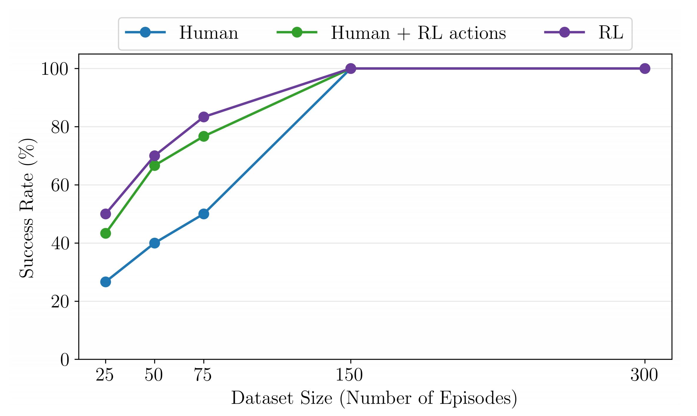 值得注意的是,正如下文即将讲到的(对应于原论文第4节),要达到与RLDG相当的表现,至少需要6-10倍的人类示范数据。对于如精确插入等复杂任务,RLDG能够实现100%的完美成功率,而仅用人类示范训练的策略即使数据量显著增加,成功率也只能达到90%的平台期