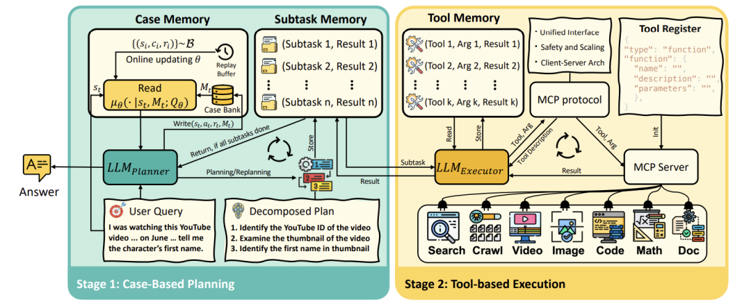规划器(Planner):由强大LLM(如GPT-4.1)驱动,是一个CBR智能体。它接收用户任务,从案例记忆中检索K个相关案例,据此制定计划(分解为子任务),并写入子任务记忆。