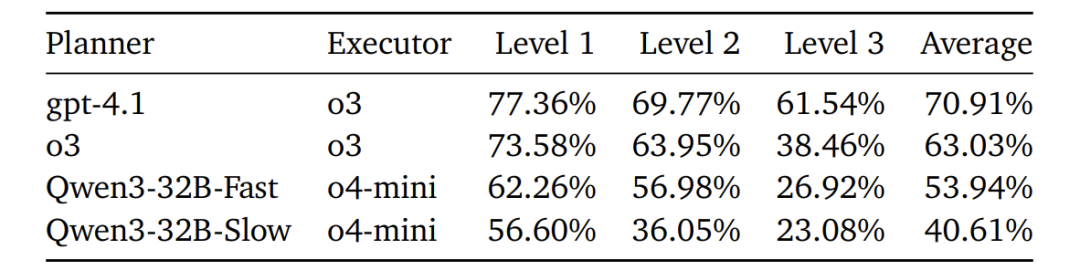 一个有趣的发现是:使用快速、非慎思的规划器(GPT-4.1)配以强大的执行器(o3),其效果(70.9%)远好于使用慢速、慎思的规划器(o3本身,63.03%)。分析表明,慢速规划器容易产生冗长、模糊的计划,甚至跳过规划直接回答问题,导致执行器困惑。而快速规划器能生成简洁、结构化的计划,更有效地指导执行器。