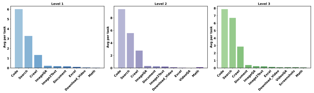 工具使用统计:随着任务难度增加,代码、搜索、爬虫工具的使用占比显著上升,说明复杂任务更依赖外部信息获取和处理。