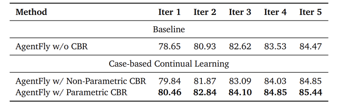 持续学习:随着迭代次数增加(案例库变大),性能持续提升,参数化CBR增益优于非参数化。