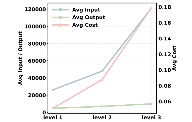 Token消耗:Level 3任务的输入Token(~121k)远高于输出Token(~9.8k),说明计算开销主要来自整合和分析多步工具的输出,而非生成最终答案。这为优化系统性能指明了方向。