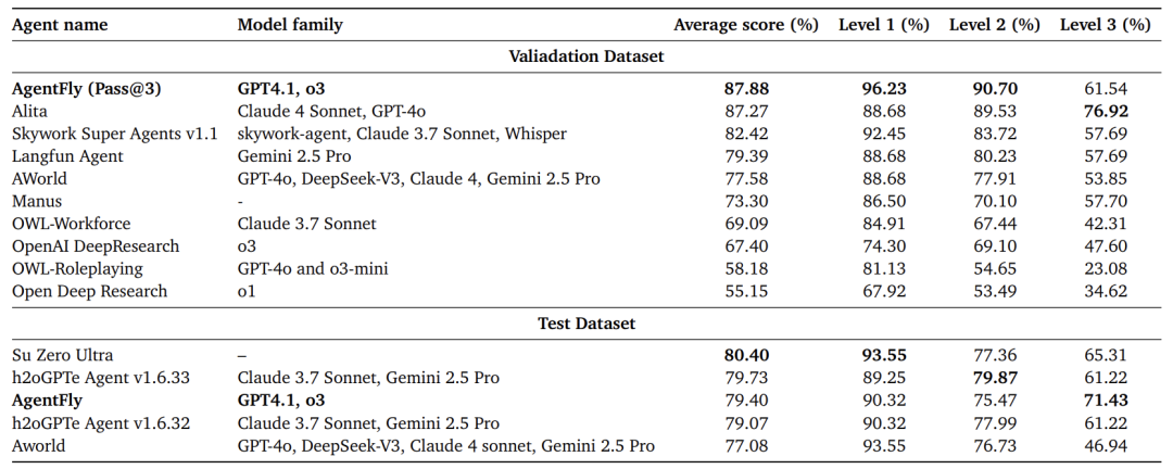 AgentFly在多个权威基准测试中表现卓越,如在GAIA验证集上达到87.88%的准确率(排名第一),在DeepResearcher上显著超越已有训练型方法,证明了其高效性和泛化能力。这不仅为构建低成本、高自适应的通用智能体提供了新范式,也推动了AI向更接近人类学习方式的方向发展。