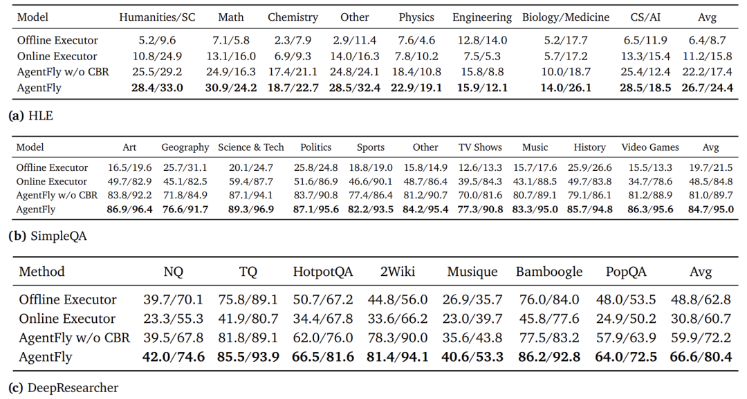 在线执行器 → AgentFly (w/o CBR):增加规划器带来全面、显著的提升(所有任务+10~30点),证明规划与工具编排至关重要。