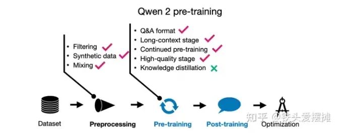 Qwen 2预训练技术总结。“持续预训练”是指两阶段预训练,即研究人员从常规预训练开始,然后进行长上下文持续预训练。