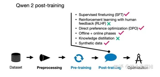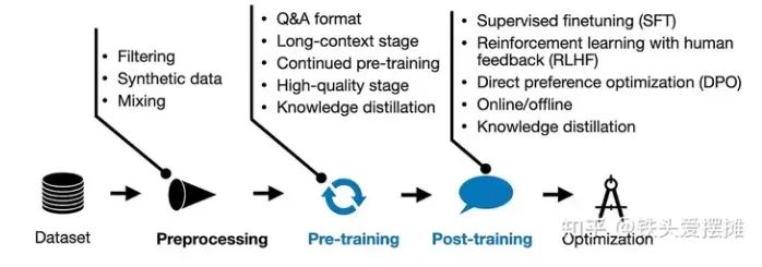 本文讨论的新预训练和后训练方法论,概述了LLM开发和训练流程