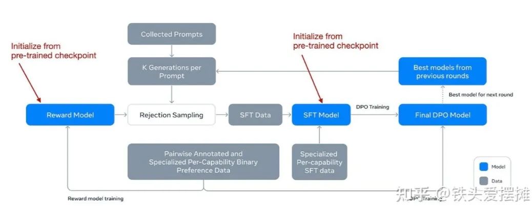 请注意,尽管他们使用了DPO,他们还开发了一个奖励模型,就像在RLHF中那样。最初,他们使用预训练阶段的检查点并利用人工注释数据来训练奖励模型。然后,这个奖励模型被用于拒绝采样过程,以帮助选择适当的提示进行进一步训练。