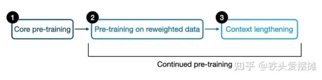 持续预训练,其中网络抓取(质量较低)数据的权重被降低;数学和代码的权重被提高