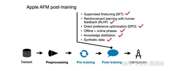 苹果似乎在训练后阶段采取了与训练前同样全面的方法。他们利用了人工标注和合成数据,强调数据质量优先于数量。有趣的是,他们没有依赖预定的数据比例,而是通过多次实验微调数据混合以达到最佳平衡。