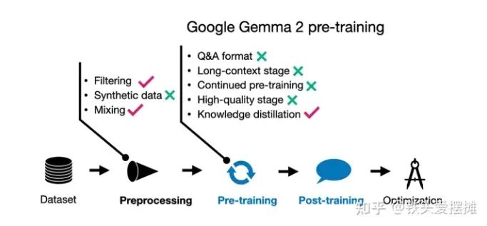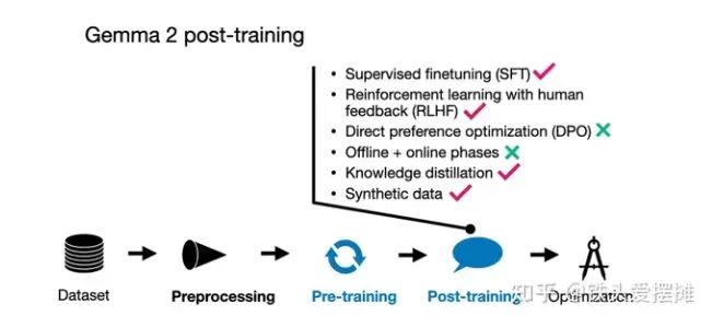 Gemma 团队似乎非常重视知识蒸馏,他们在与 Apple 类似的预训练和后训练中都使用了这一技术。有趣的是,他们并没有采用多阶段预训练方法,或者至少他们在论文中没有详细说明这一点。