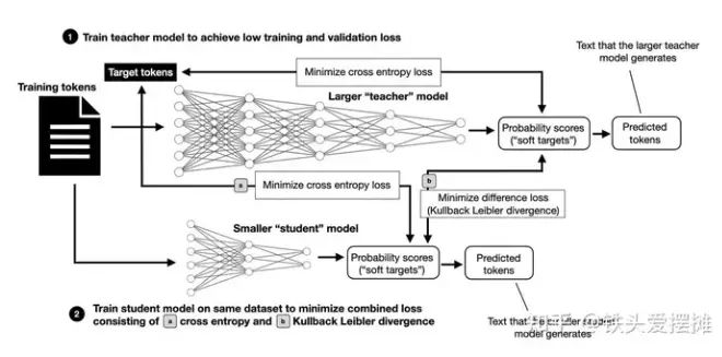 知识蒸馏,如上所述,仍然涉及在原始数据集上进行训练。然而,除了数据集中的训练标记外,被训练的模型(称为学生)还从较大的(教师)模型接收信息,与没有知识蒸馏的训练相比,提供了更丰富的信号。不利的一面是,你必须:1)首先训练较大的教师模型,2)使用较大的教师模型计算所有训练标记的预测。这些预测可以提前计算(这需要大量的存储空间)或在训练过程中计算(这可能会减慢训练过程)。