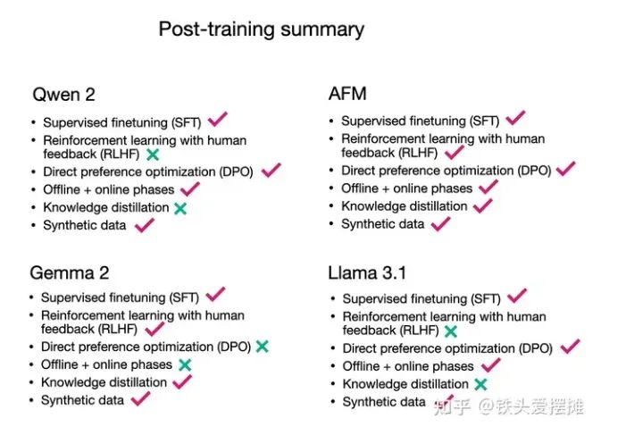 当谈到后训练时,没有一个流程是完全相同的。似乎拒绝采样现在是后训练过程中常见的做法。然而,当谈到DPO或RLHF时,目前还没有一致的意见或偏好。