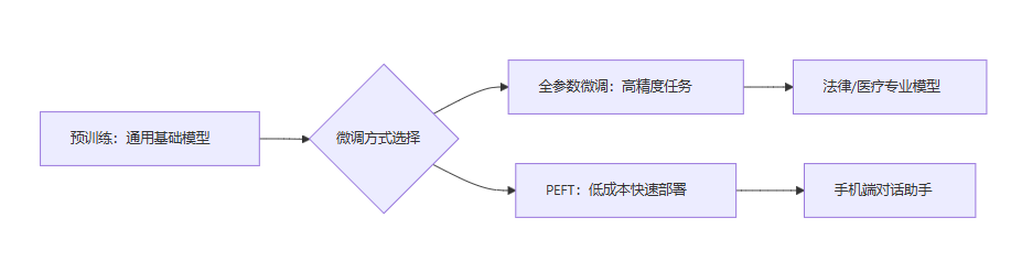 A[预训练:通用基础模型] --> B{微调方式选择}